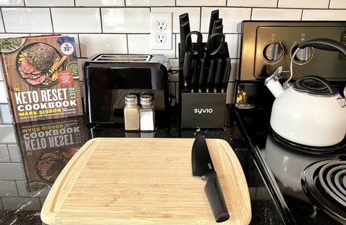 Kitchen & Dining Room - There is a large kitchen with plenty of cabinet and counter space, including a brand-new kitchen bar with three bar stools. Dish sets and silverware are included for at least six people as well as pots, pans, ovenware, knives, cutting boards, and cooking utensils. The kitchen is complete with all standard appliances including a dishwasher, microwave, stove/oven, and refrigerator with freezer. The coffee station is a Keurig machine with complimentary k-cup coffee, cream, and sugar. The dining area provides an additional four chairs around a large dining table.