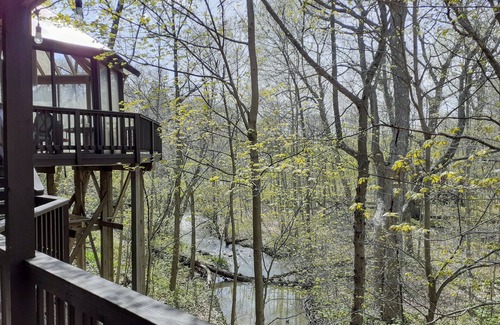 The bedroom has a queen bed, the sofa can sleep one and an extra queen floor mattress is available for additional guests. We also have a playpen for babies. The ceiling height of around 7 ft provides a warm cozy atmosphere. Guests have an exclusive deck with outdoor chairs, plus access to the common deck that houses a screened-in gazebo with a large dining table for 8, overlooking a creek, and outdoor sofas to rest and relax with a firepit. Guests can also use the common grill. Step out of the apartment itself to enjoy an uninterrupted forest view with a creek and an immersive experience - what it feels like to live in the woods or in a Treehouse! Guests may be able to also enjoy the visible wildlife - from multiple species of birds if you leave your bedroom window open in the morning, or watch a slow tortoise complete the entire trail of the creek. And in winter, possible deer. Read a book on our beautiful patio, enjoy a meal in our screened in gazebo or a coffee on the bistro table! A great place for a quiet and amazing getaway!