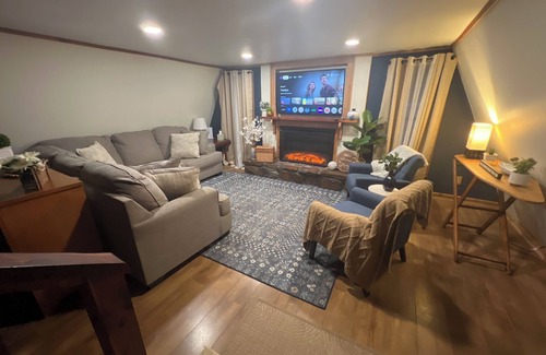 Step into Wister Ridge Aframe via a convienent keyless entry and you'll instantly feel at ease. The living room features an electric fireplace with mood lighting, if desired. You can actually just use the lighting feature without the heat in the warmer months just for your desired ambiance. Relax on the comfy sectional or two accent chairs provided.