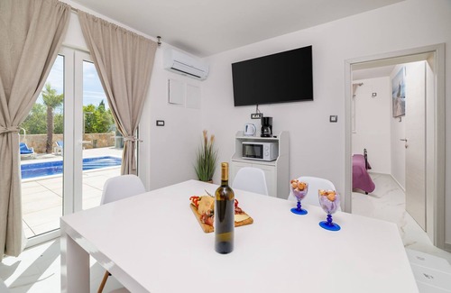 This holiday flat is intended for up to 4 people and consists of a small living room, a dining room with kitchen, two bedrooms, a bathroom and a private 20 m² terrace. The terrace and kitchen have a pleasant view and face the pool side of the house. This holiday flat is equipped with two air conditioning units, one in the dining room/kitchen and another in the master bedroom. The outside area of the house offers plenty of space. There are two parking spaces for each holiday flat and a parking space for trailers. However, the centrepiece of the property is the 28 m² swimming pool. It boasts excellent water quality thanks to the modern salt electrolysis cleaning system. Sun loungers and a large barbecue are available at the pool area. The location of the house is in the heart of the island of Krk, so everything is within easy reach. Various beaches, a sports field, the Biserujka stalactite cave, the popular healing mud bay in Cizici and numerous hiking trails can be reached in just a few minutes.