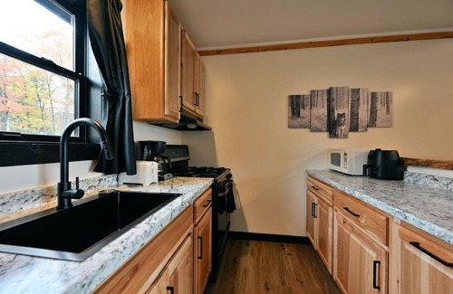 Looking for a cozy getaway in the heart of nature? Look no further than the Wolf's Den cabin at The Spot. The Wolf's Den is one of four newly renovated cabins on Buskey Bay. This is easy accessible 1-bedroom, with King size bed, vacation cabin in northern Wisconsin on Buskey Bay part of the extensive and beautiful Pike Chain of lakes with its crystal clear waters near Iron River, Wisconsin. The cabin is the perfect place to enjoy a relaxing and fun-filled stay, whether you're looking for adventure or tranquility. You can swim, fish, or dock your boat at the large pier on this 88 acre portion of the Pike Chain of Lakes containing 4 easy connecting bodies of water. Or hike, bike, ATV, or snowmobile with direct access from the cabin. Maybe you prefer to just curl up by the fireplace with a good book, or roast marshmallows over the fire pit, it's all right here! And don't worry about the weather, the Wolf's Den has both heat and air conditioning. Plus, there is Wi-Fi and a Smart TV for streaming your favorite apps and channels. Book your stay today and experience the beauty and charm of northern Wisconsin! The common area features a charcoal grill, firepit, yard games and by the lake you'll find a 2 person kayak and a couple of paddle boards for some extra fun on the lake.