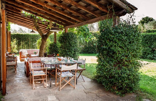 The garden of the villa is always perfectly kept and features plenty of outdoors furniture for the 2 covered verandas as well as for the pool area... Which makes it perfect for relaxing, and enjoying the views with a glass of wine or for al fresco dining (a vintage barbecue is available).