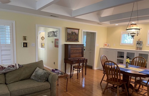 Maggie's Cottage is a lovely 2-bedroom, one bathroom guesthouse nestled on three gorgeous acres overlooking the gardens, pool and hot tub. The master bedroom has a king bed, and the guest bedroom has a full bed. The full bathroom has a large walk-in shower and two sinks. The galley style kitchen has a full-size refrigerator and stove with an oven. A large living area and dining table are centered around a large flat screen TV.