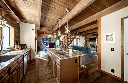 The main family/living room has an open design with vaulted ceilings, a gorgeous wood burning fireplace and a 75” LED Smart TV. We have Starlink WiFi and you can also access your own Netflix/Hulu/HBOMax accounts if you prefer or fall down the rabbit hole and disconnect while at Wonderland.