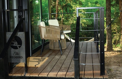 Escape to a romantic hideaway nestled under lagre oak trees. This cozy cabin offers a peaceful retreat surrounded by nature, perfect for couples looking to unwind and reconnect. Relax on the private deck, sip wine under the stars, or cozy up inside with all the comforts. Each cabin includes a king-size bed, TV, Wi-Fi, microwave, fridge, Keurig, and a private bathroom just a few yards away.