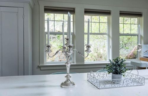 The studio has an open concept layout, vaulted ceilings, and large windows that fill the space with natural light. The furniture and decor are inspired by a vintage farm house in a woodlands setting.