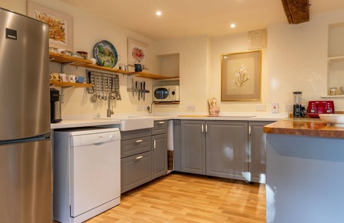 Stepping through the front door you find an entrance hall which leads to the impressive foyer with doors opening out to the garden beyond. A Victorian stove is the centrepiece of this space giving a taste of the antique treasures to be found in this cottage. In the living room is a woodburning stove and an eclectic sitting area for all guests to have their own space. Original wooden beams and artwork give this room its personality. The kitchen has a dining area with large windows framing the cottage garden and is fully equipped for preparing your favourite meals. Upstairs the three bedrooms share two bathrooms and showcase vaulted ceilings and exposed beams. Each room is a peaceful escape to enjoy quiet village life and get a good night's sleep.
