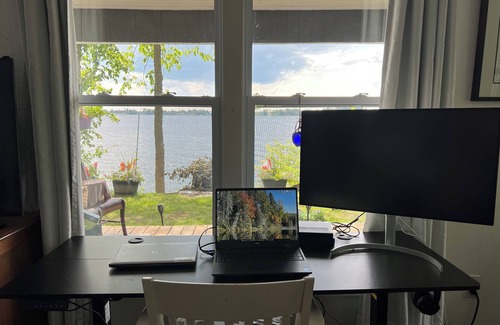Cabin on Muskrat lake with a covered front porch, beautiful panoramic view of the lake. Fully set up for remote work with a sit/stand up desk and large monitor. Back porch with a barbecue. Two bedrooms, one with a queen and one with a twin mattress (two stacked on top of each other in case you want to pull one off for an additional person ). Fully equipped kitchen. Full bathroom.