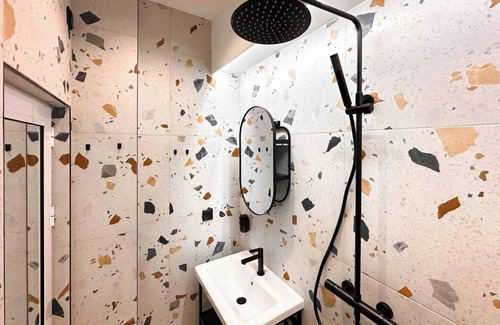 The bathroom is a true highlight, with stunning terrazzo tiles, a walk-in rainfall shower, and all essential toiletries provided.