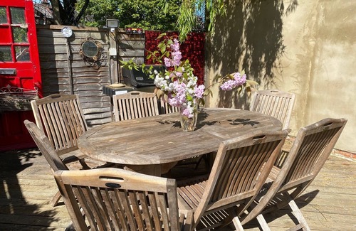 You can comfortably sit 10 people at the dinner table with a further 10 people seated on the decking. For those wanting a continuous long table, it's possible to bring the kitchen table to the decking in summer time - or we can configure the double reception room to fit a long table - this needs to be requested in advance....