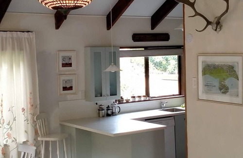 Originally designed and built by the present owner in 1985, the two bedroom cottage has undergone numerous additions such as the the extensive wrap around decking from the front sliding door, right round the back, overlooking the bubbling Grehan Stream and Reserve to the back door. A new verandah designed & built by the owner ensures that guests can enjoy a large portion of the decking with its gas bbq, under cover, still with its views and sound of the stream and birdsong, well into the late afternoon and evenings in most weathers. A new picnic seating area has been created o nthe oppoite side of the stream now[ August 2025] so awesome, [la vie en rose beside the Seine]