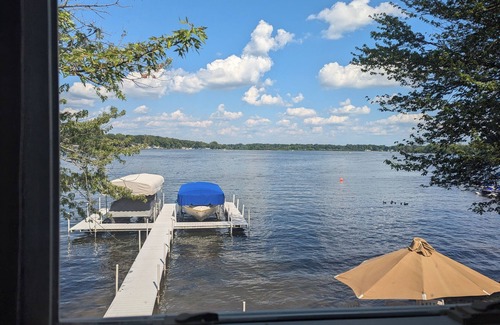 There is no better place on the chain with better accomodations to watch the boats as they pass between the lakes than this prime waterfront location from this brilliant 3-bedroom home between North Webster, Syracuse, and Warsaw. This is no cottage, it is a year-around home that offers a comfortable stay right on the lakefront of Big Barbee, which is the largest and only ski lake on the chain of seven lakes. You are a stone's throw from Danny's Pizzaria and Bar, Barbee Hotel and Restaurant, and Lake Life Bar and Grill for convenient food, beer and cocktails to enjoy the lake atmosphere (no car necessary). If you are bringing your own boat, the pier has room for 2 more boats and WaveRunners (or Pontoon rental is an option). Everyone will find their perfect spot to unwind, whether it is lounging outside on the large deck with 8-person table and plenty of chairs, playing in the grassy side yard under a shady tree, dipping your toes in the cool water; or inside looking at the lake from the sunroom, gazing at the lake from the giant picture window in the living room, preparing a snack in the generous kitchen while looking out at the lake. Did we mention you can see the lake from nearly every window?! You won't give up the comforts of home because the house has air conditioning, WiFI, washer and dryer, and gas grill. End each night in one of the 3 bedrooms - the main level primary bedroom with queen bed and ensuite bathroom and 2 upstairs bedrooms each with double/twin bunk beds.