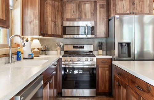 The main-level bedroom boasts a king bed, while the loft includes two queen-over-queen bunk beds. With bathrooms on both levels—a bathtub/shower combo downstairs and a stand-up shower upstairs—there’s plenty of space for everyone.