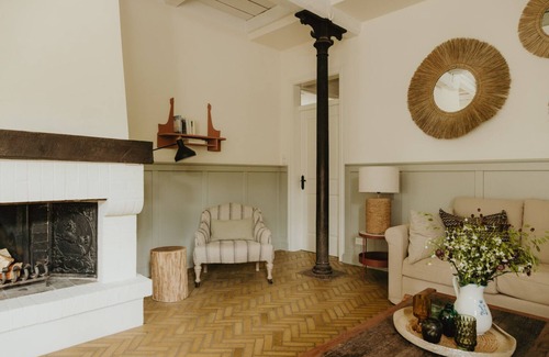 The kitchen is equipped with an oven, a stovetop, and a refrigerator, as well as a coffee maker, an electric kettle, and cookware. Bathroom amenities include a hair dryer, towels, and toilet paper. Other amenities at this 2-bedroom, 1-bathroom rental include a fireplace, bed sheets, and heating.