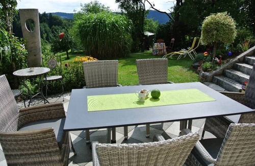 Schöne, erholsame vier Sterne Ferienwohnung mit Panoramablick. Die Wohnung (80qm) ist ein Neubau und liegt direkt neben dem Qualitätswanderweg "Goldsteig". Es gibt 2 Schlafräume mit jeweils einem Doppelbett, wobei eines davon eine Übergröße von 2,00m x 2,00m hat. Die Wohnküche ist voll ausgestattet mit Geschirrspüler, Backofen, Kaffeemaschine, Kühlschrank, Mikrowelle und Toaster. Außerdem ist ein Radio und ein SAT-TV vorhanden. Das Bad verfügt über ein WC, eine bodenebene Dusche, einen Bademantel und einen Fön. Die Ferienwohnung besitzt eine Infrarotkabine, sowie 2 Terrassen (vom Schlafzimmer und der Wohnküche aus zugänglich) mit Zugang zum Garten und eine hauseigene Sauna mit Tauchbecken. WLAN- Nutzung, Endreinigung, Bettwäsche, Handtücher und Geschirrtücher sind im Preis enthalten. Gegen Aufpreis und auf Anfrage stehen ein Frühstückskorb, Waschmaschine und Trockner zur Verfügung. In jedem Raum befindet sich außerdem ein Insektenschutzgitter.