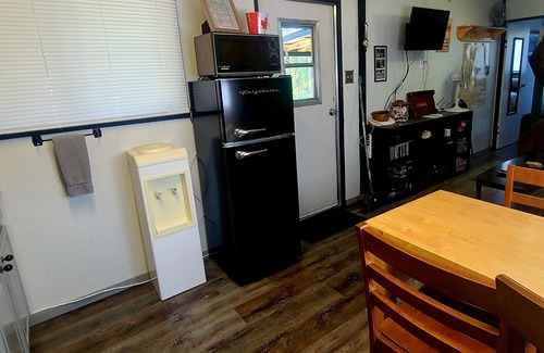 This compact refurbished trailer now offers a cozy cabin feel, 385 sqft, is designed for maximum efficiency of space, can sleep up to 4 guests, and offers a cozy retreat when you're not busy enjoying the outdoors.