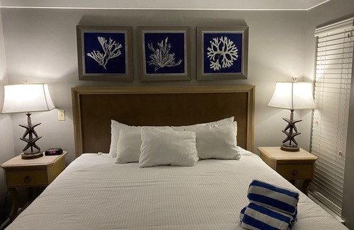This spacious two-bedroom resort suite sleeps 6 with a king bed in the master bedroom, two twin beds or one full bed in the guest bedroom and a queen sleeper sofa in the living room. Additional amenities include a full kitchen and dining area, washer/dryer and a balcony. Property has 3 pools, hot tub, amenities, and is close to the beach. All linens and towels provided.