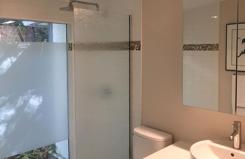 The Escape is the newest luxury small house on the 11 acre Xanadu Estate. The Escape is set in the trees and is perfect for a couple or a small family. The Escape has warm underfloor heating, a gourmet kitchen with Bosch appliances, a dishwasher, and a luxury spa bathroom. Your private bedroom has a comfortable queen bed, walk in closet, and a desk that overlooks your private forest.