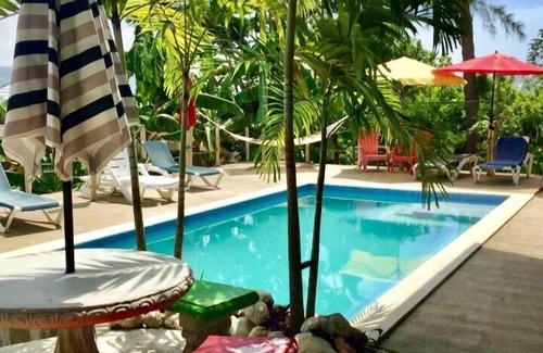 There is also the Lion's Den out back, a large chill out area with beautiful mountain views over looking a sugarcane field. There is an inground, salt water pool, a full outdoor kitchen with two jerk pans and dining table. The entire back of the villa is covered, with a long bench along the back for lounging around with sun chairs, hammocks and hammock chairs for reading or napping.