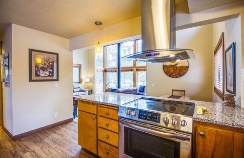 This beautiful home features wood furnishings and floors and lets in gorgeous natural light. The entryway leads into the living area, with wood stove and comfortable seating for the whole group. The open layout is great for gatherings and the large dining table and modern kitchen make entertaining a breeze. There is also an assortment of DVDs for the best movie nights!