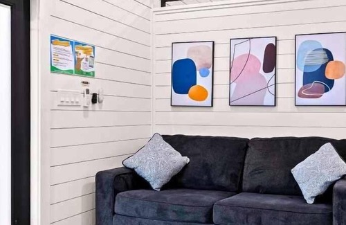 This glamping cabin has a front bedroom, a guest bedroom, and 2 spacious bathrooms. The upstairs leads into a nice loft for the younger ones to enjoy. There are spiral stairs that lead onto the top deck. The kitchen area is spacious with a refrigerator/freezer, convection microwave, large sink, and more with a dining table and sofa. Check out is at 10am, Check-in is at 4pm. Water zone and floating obstacle course access is included in your stay.