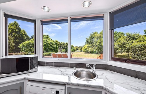 The large open plan kitchen and dining area open on to the expansive back deck, which have amazing views across the luscious lawns & trees to Lake Louise & the Swiss chapel. This is the perfect spot to sit back relax & unwind after a hard day exploring. Or whip up a gourmet bbq of fresh, Tasmanian produce gathered from the local areas.
