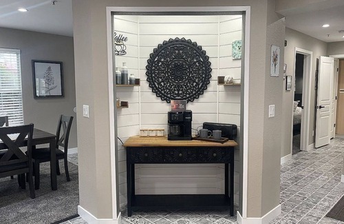 The kitchen is equipped with essential appliances that make meal preparation a breeze. You’ll find a microwave for quick snacks, a stove and oven for cooking, and a dishwasher to handle the cleanup. For coffee lovers, there’s a Keurig coffee maker to brew your favorite cup, along with a toaster for breakfast essentials. The kitchen sink and freezer round out the space, ensuring you have everything you need at your fingertips.