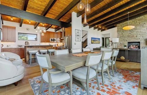 • Open-Plan Living and Dining: Gather around the fireplace for evening conversation, or savor meals at the large bespoke dining table that seats 8-10 guests comfortably. Vaulted ceilings and panoramic windows create an atmosphere of openness and connection to the landscape beyond.