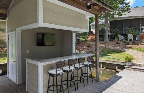 Gentle slopping lot to water’s edge and boathouse with boat and jet ski lifts. Guests are able to use the boat lift, and we have added a dock extension to accommodate pontoon boats. Enjoy food and drinks on the dock bar with seating for 4. Additional seating on the dock - wrought iron table (with umbrella) and 4 chairs, 2 wrought iron lounge chairs and 2 Adirondack chairs overlooking the lake