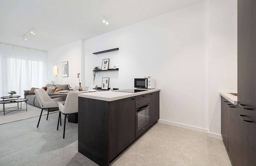 This exclusive and stylish apartment is designed for four people. It is located on the third floor and features a balcony where guests can relax in a friendly atmosphere. The unit offers a tastefully decorated living room with a double sofa bed, two modern black tables, a cabinet for handy trinkets, a flat-screen television, and a dining table with chairs. In the evenings, you can sit here to relax with your favorite programs. Convenient and quick preparation of meals is made possible by a practically equipped kitchenette. At the disposal of visitors here are such appliances as an induction hob, microwave, oven and electric kettle. In the elegant bedroom there is a large and comfortable double bed, a closet, cabinets and a desk that allows remote work during business trips. Decorated in muted shades of beige, the bathroom offers a shower, washing machine, a welcome toiletries set, towels and a hair dryer. The carefully created arrangement makes the space functional while looking striking. It's worth coming here for both a short trip and a long-term stay.