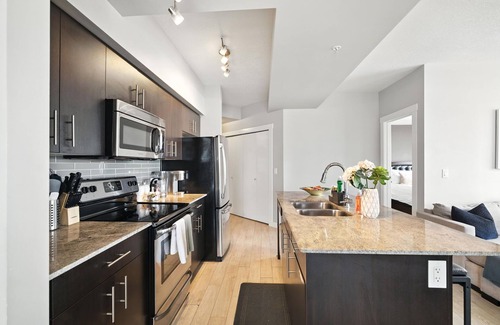 Welcome to our stylish 2-bedroom, 2-bathroom suite in the heart of Edmonton's dynamic Ice District. Conveniently located just a 10 - 15 min drive to Downtown Edmonton. Perfect for up to 4 guests, this modern urban retreat offers the utmost in convenience and comfort.
